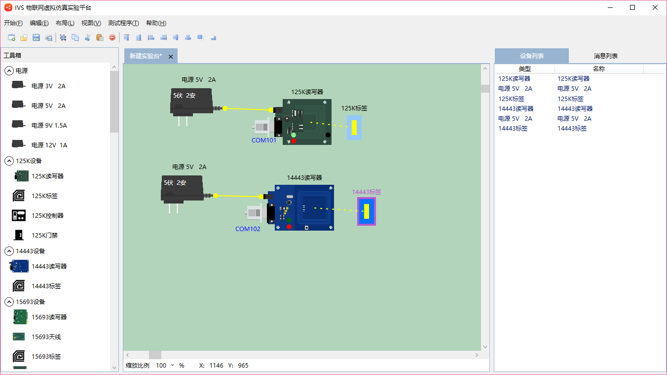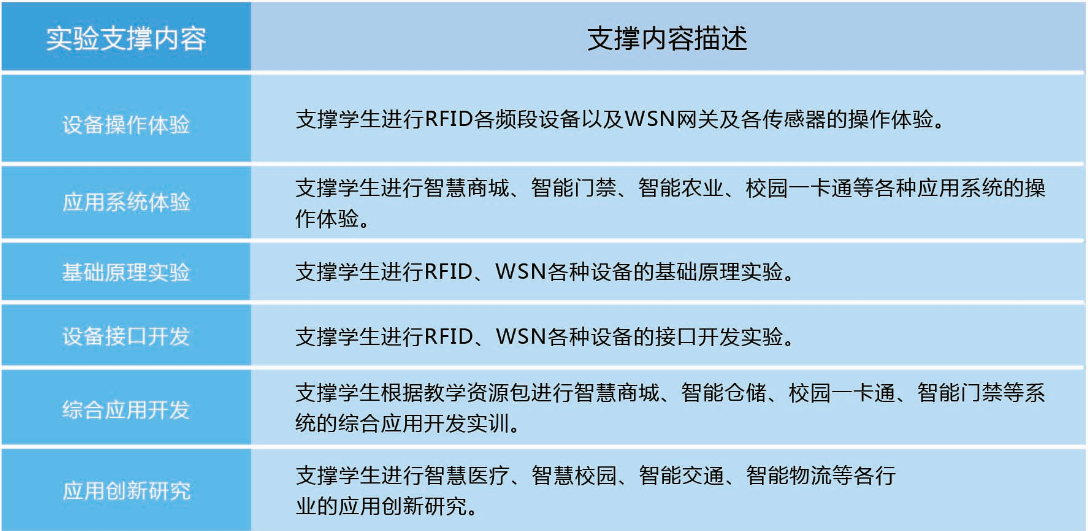 《物聯網虛擬仿真實驗平臺》虛擬仿真了各種RFID、WSN等常見的物聯網感知層設備。具有真實設備的完整接口和特性,可以通過串口及網絡進行訪問。可以支撐的實驗內容如下表所示: